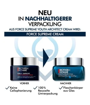 Aus der Youth Architect Cream wird die Force Supreme Cream. Entdecke jetzt die die hochwirksame Anti-Aging-Pflege von Biotherm Homme, die perfekt auf die Bedürfnisse der Männerhaut abgestimmt ist. Gezielt und allumfassend wirkt die regenerierende Gesichtspflege den Zeichen der Hautalterung entgegen. Ein effektiver Wirkstoffkomplex lässt Falten, Festigkeits- sowie Feuchtigkeitsverlust, Verlust der Hautausstrahlung und einen fahlen Hautton der Vergangenheit angehören. Zudem profitiert die Haut von der beruhigenden und zugleich stimulierenden Wirkung der verjüngenden Creme. Intakte Zellen erhalten einen kostbaren Schutz vor negativen äusseren Einflüssen. Jetzt in nachhaltigerem Design.