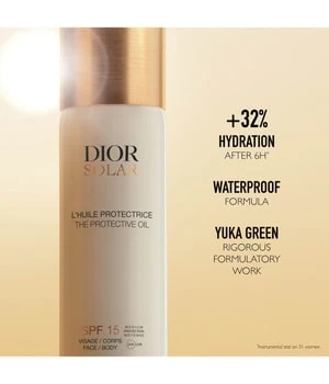 Das Dior Solar L’Huile Protectrice Visage et Corps SPF 15 Sonnenöl wird aufgesprüht, um Haut und Haar in ein seidiges Finish zu hüllen. Es ist praktisch und lässt sich leicht und gleichmäßig auftragen.