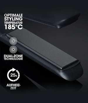- Optimale Stylingtemperatur 185°C: heißere Platten schädigen das Haar, kühlere Platten erzielen kein zufriedenstellendes Ergebnis