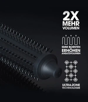 Erhalte 2x mehr Volumen und verleihe Deinem Haar Fülle und Schwung. Mit den glatten, 5 mm langen Borsten kannst Du nahe am Ansatz stylen, um maximales Ansatzvolumen zu kreieren. Für ein sanftes Gleiten und ein ziepfreies Styling.* Die smarten Ultra-Zone Technologie erkennt die Bedürfnisse Deiner Haare und erwärmt den 32 mm breiten Stab konstant auf die optimale Stylingtemperatur von 185°C für gesünder aussehendes, langanhaltendes Volumen, ohne extreme Hitze.**