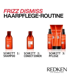 Fashion, Inspiration, Innovation – das ist Redken 5th Avenue NYC. Die Redken Haarpflege-Produkte sind auf unterschiedliche Bedürfnisse abgestimmt und garantiert somit eine simple und gleichzeitig optimale Haarpflege-Routine – beim Friseur und im eigenen Badezimmer. Entdecken Sie die perfekte Pflege für Ihr Haar und erleben Sie die professionelle Redken-Expertise jetzt ganz einfach zu Hause. Geschmeidiges Haar mit voller Frizz-Kontrolle bringt Ihnen der Redken Frizz Dismiss Conditioner für unkontrolliertes Haar. Dabei ist die sanfte Formel mit Babassu Öl für alle Haartypen und die tägliche Verwendung geeignet. Der reichhaltige Pflegekomplex glättet die Haaroberfläche und wirkt nährend bis in die innere Haarstruktur. Somit erzielen Sie auf sanfte Art und Weise gesunde, geschmeidige Haare, die wirken, wie vom Friseur geglättet. Die ebene Oberflächenstruktur ermöglicht eine verbesserte Kämmbarkeit. Dafür verwenden Sie den Conditioner, nachdem Sie Ihre Haare gewaschen haben. Achten Sie grundsätzlich darauf, dass die Wassertemperatur auf Kopfhaut und Haaren nicht zu warm ist. Geben Sie eine kleine Menge in die Längen und speziell auf die Spitzen. Einige Minuten einwirken lassen und gründlich ausspülen. Anschließend zum Trocknen in ein Handtuch wickeln und vorsichtig trocken tupfen.