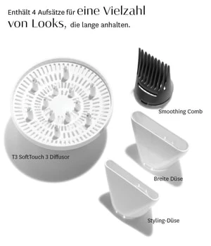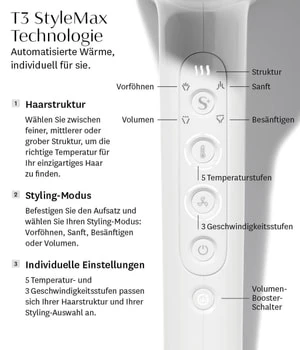 Lernen Sie den perfekten Partner für Ihr Haar kennen. Der professionelle Haartrockner T3 Featherweight StyleMax passt Temperatur und Luftstrom automatisch an Ihre Haarstruktur und Ihre Styling-Ziele an, um bessere Ergebnisse mit weniger Schäden zu erzielen.* Optimiert für jeden Haartyp, lassen sich vier Aufsätze mit vier einzigartigen Styling-Modi kombinieren, um das Haar vorzuföhnen, zu glätten, zu besänftigen oder ihm Volumen zu verleihen. Geben Sie einfach Ihre Haarstruktur ein, befestigen Sie den Aufsatz und wählen Sie den passenden Styling-Modus. Die fortschrittliche T3 StyleMax™ Technologie passt automatisch 5 Temperatur- und 3 Geschwindigkeitsstufen an, um Ihre Ergebnisse zu maximieren und Hitzeschäden zu minimieren.