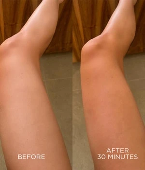 Eine hochwirksame Hautpflege mit einer Mischung aus Vitamin C, Beta-Glucan und Hyaluronsäure glättet und hellt die Haut auf, sie spendet ihr bis zu 48 Stunden lang intensive Feuchtigkeit über mehrere Hautschichten hinweg. Keine Leitfarbe bedeutet kein Abfärben – nur ein gleichmäßiges, lang anhaltendes, streifenfreies Strahlen, und zwar schnell.