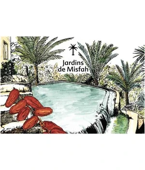 Im Dorf Misfah Al Abreyeen erleben Sie „Tausendundeine Nacht“ pur. Blumen gesäumte Gassen, das fröhlichen Plätschern des Wassers, Palmen, so weit das Auge reicht. Man kann die Worte von Amin Maalouf nicht vergessen. „Ein Bissen Dattel enthält nicht nur Fruchfleisch, das deinen Hunger, sondern auch die Süße, den Duft und die Farbe, die deinen Geist nährt.“ ‚Jardine de Misfah‘ ist eine olfaktorische Pause, ein Moment, der in der Zeit schwebt, eine Harmonie der Düfte, in der sich das frische Flüstern der Blütenblätter mit einem Akkord von cremigen Datteln, Honig und Süßwasser verbindet.